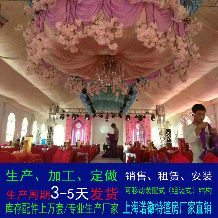 首先要根据自己邀请的婚宴人数来确定婚礼篷房的大小和采用的类型。户外婚礼篷房常见的是婚庆篷房,活动篷房,派对篷房,这些都有很多种布局的选择。使用婚庆篷房就比较喜庆,时尚。使用活动篷房的话氛围就比较能放得开,使用派对篷房就比较亲密。